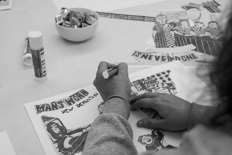 Der mit der Fotoserie „Die Baustelle" vertretene österreichische Künstler Hubert Lobnig gestaltete einen performativen Workshop mit den Teilnehmenden und fotografierte diese beim Nachstellen der für ihren Berufsalltag typischen Handbewegungen und Körperhaltungen. Diese vom Künstler als „Re-Enactments“ bezeichnete Posen wurden von den Lehrlingen grafisch weiterbearbeitet und dabei zwei Varianten von Selbstporträts angefertigt: einmal „arm“ und einmal „reich“. Schließlich wählten die Teilnehmenden – ausgehend von Fragestellungen zu fairen Rahmenbedingungen von Arbeit – eine Überarbeitung aus und gestalteten aus Karton und Gips noch einen passenden Rahmen für ihr Werk.